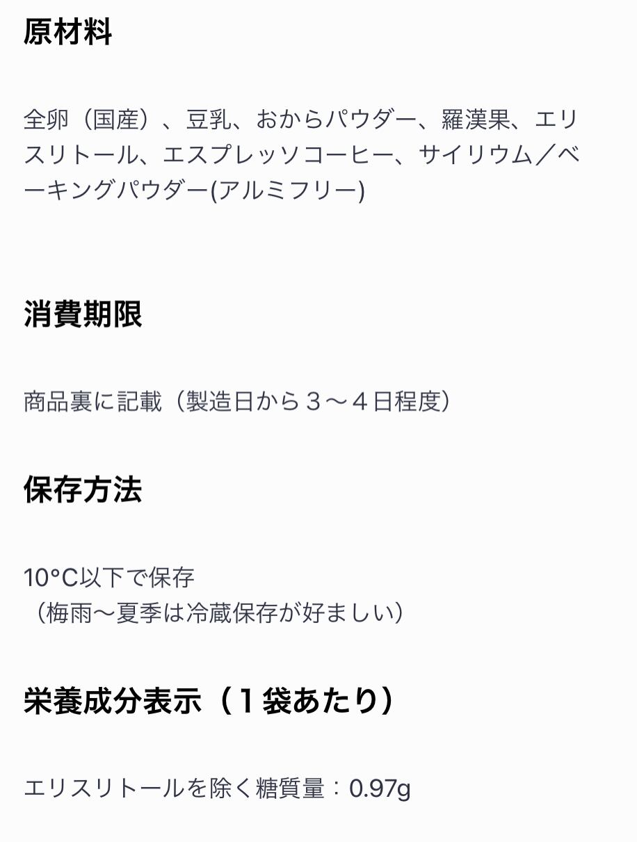 全卵(国産)、豆乳、おからパウダー、羅漢果、エリスリトール、エスプレッソコーヒー、サイリウム/ベーキングパウダー(アルミフリー)