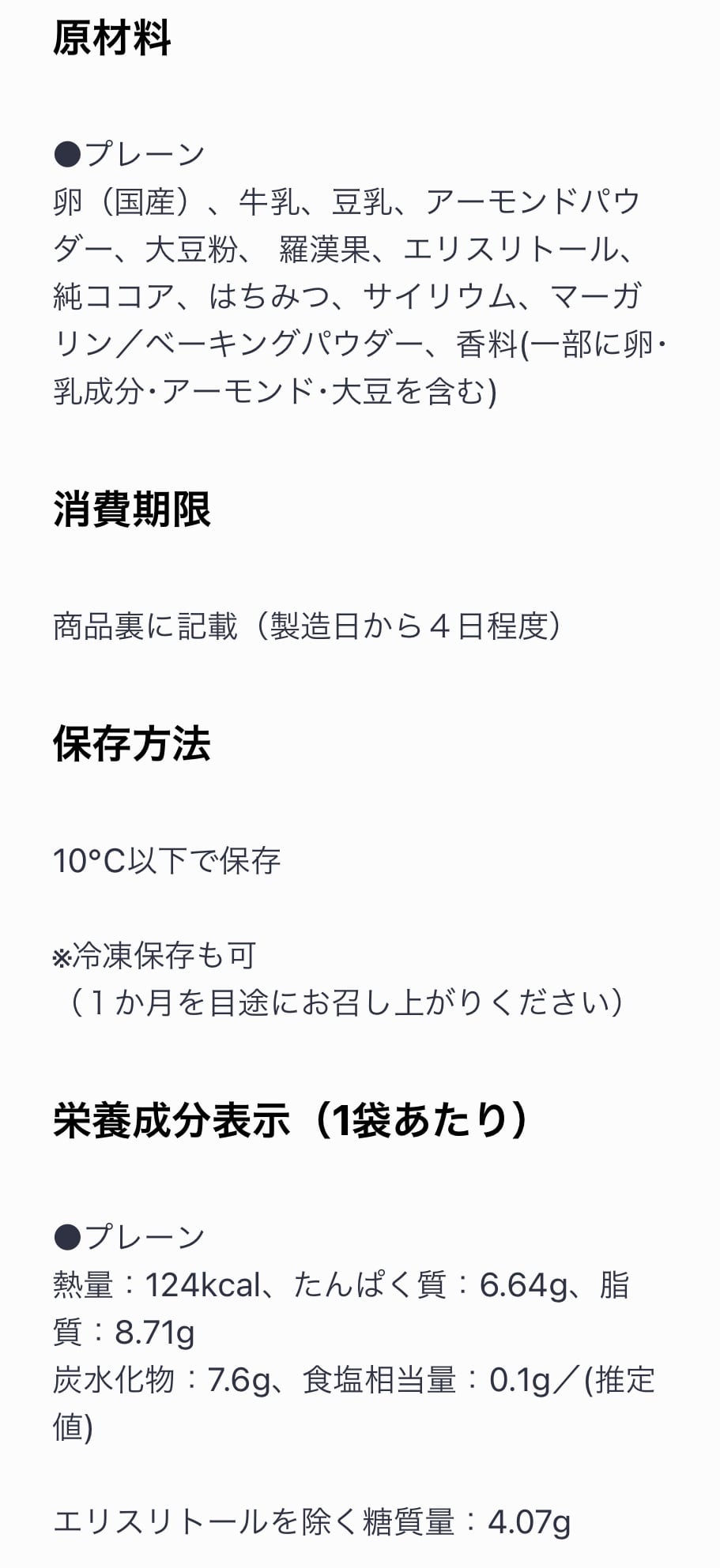 卵(国産)、牛乳、豆乳、アーモンドパウダー、大豆粉、 羅漢果、エリスリトール、純ココア、はちみつ、サイリウム、マーガリン/ベーキングパウダー、香料(一部に卵・乳成分・アーモンド・大豆を含む)