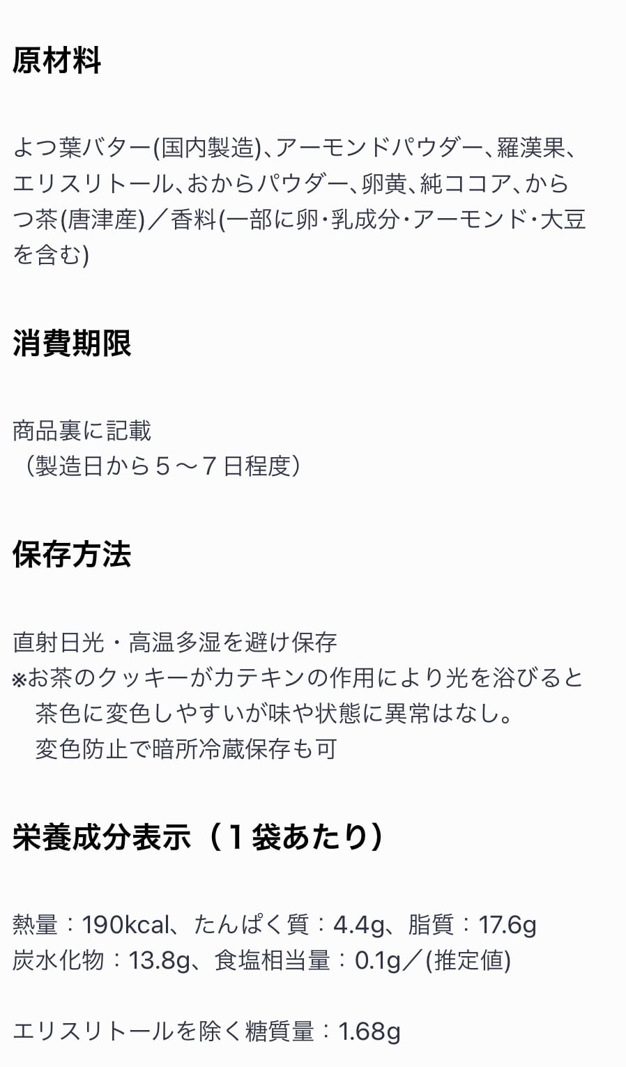 よつ葉バター(国内製造)、アーモンドパウダー、羅漢果、エリスリトール、おからパウダー、卵黄、純ココア、からつ茶(唐津産)/香料(一部に卵・乳成分・アーモンド・大豆を含む)